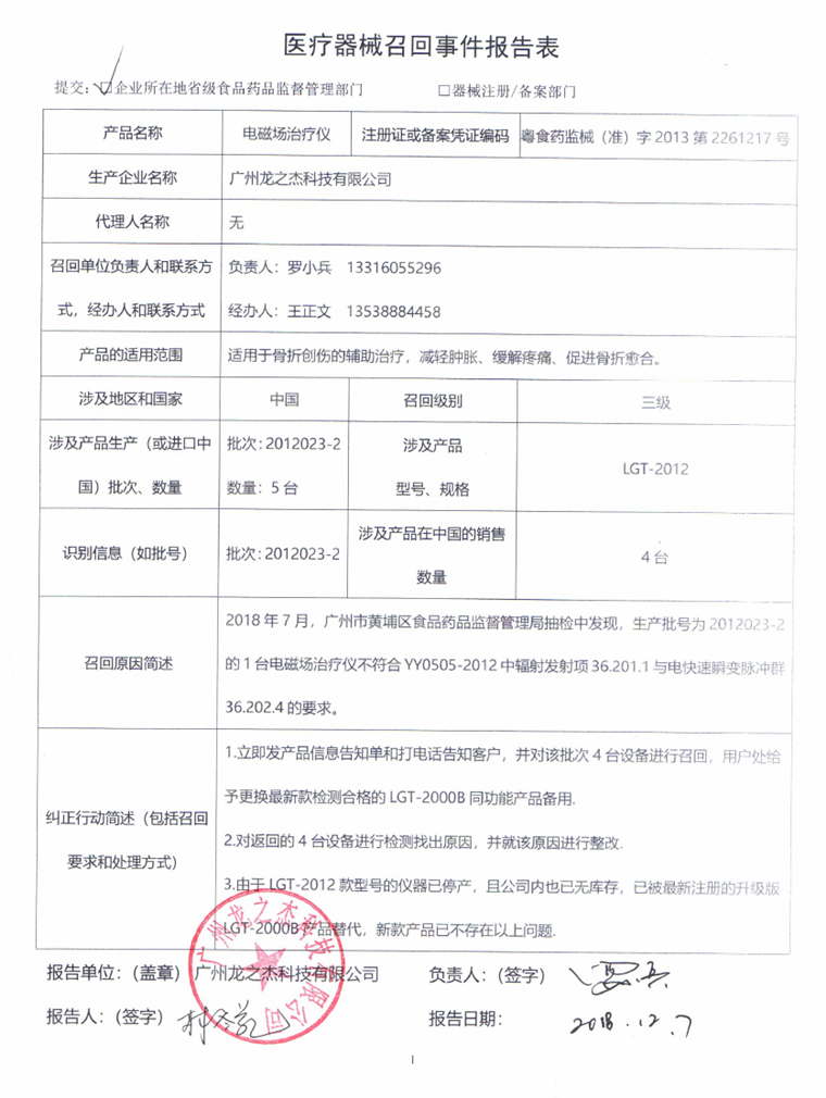 广州龙之杰科技有限公司报告,该公司生产的电磁场治疗仪经检验,不符合标准规定。广州龙之杰科技有限公司主动召回有关产品,召回级别为三级。涉及产品的型号、规格及批次等详细信息见《医疗器械召回事件报告表》。