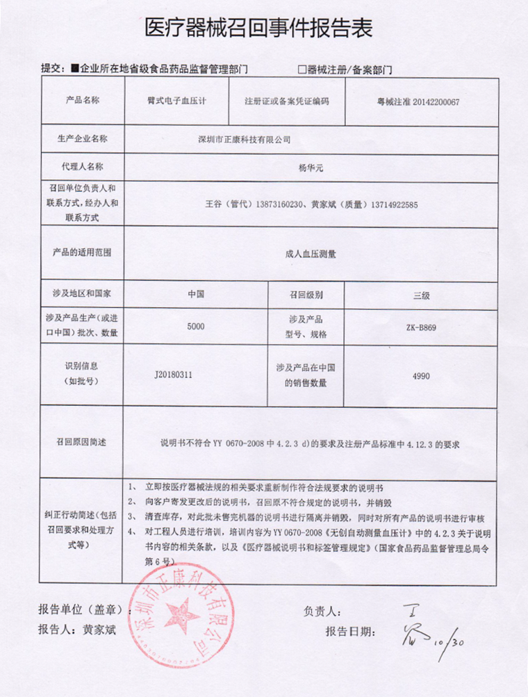 深圳市正康科技有限公司对臂式电子血压计主动召回