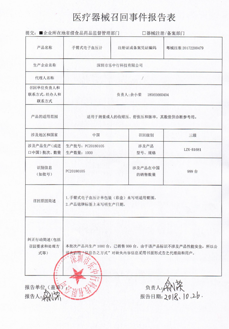 深圳市乐中行科技有限公司对手臂式电子血压计主动召回